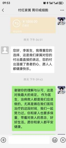 肿一科李医生在患者家属表达感谢、主动转账1000元时,坚决予以退还,并以专业、温暖的话语安抚家属情绪,用实际行动诠释了医者仁心的职业操守。
