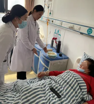 患者刚刚入院身体不适、肿八科护士袁若素及时送上温水并给患者准备吃的,体现以患者为中心的护理理念。