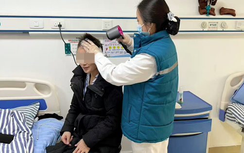 细微之处显真情,优质服务暖人心。肿八科护士袁若素为行动不便患者吹干头发,用温柔守护,让病房更有温度。