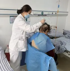 肿一科护士长和护理徐忆梦为病人洗头发,用心护理,以爱暖身,清爽舒适,伴您康复……
