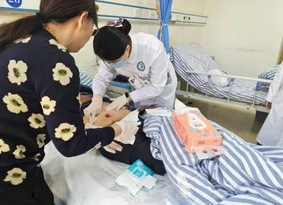 肿二科护士徐紫月为患者清洗纱布垫,小小举动,温暖患者心灵让冬日有暖,疼痛有伴,康复有期。