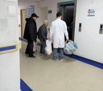 郭医生送患者出院,反复交代到家了让给医生回电话,还有后勤人员为患者安排车辆。