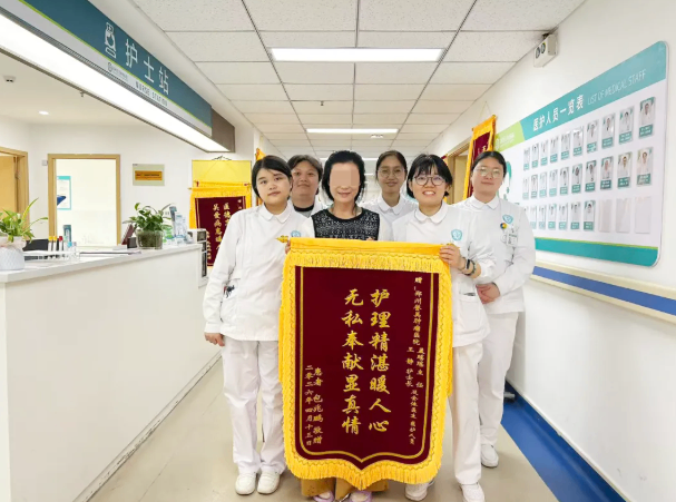 第三面锦旗,送给肿瘤七科的孟瑶瑶主任、王静护士长以及全体医护人员,写着护理精湛暖人心 无私奉献显真情”。“化疗期间,护士们像亲人一样照顾包先生,细致入微、任劳任怨,是她们的陪伴和照料,让包先生能够顺利完成治疗。”家属动情地说。孟瑶瑶主任以及护理团队代表接过锦旗,笑着表示:“细致照顾患者是我们的本职工作,看到包先生能够康复,所有的付出都值得。”