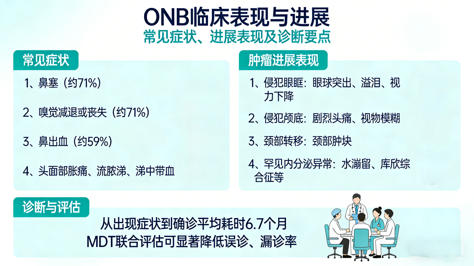 由于肿瘤紧邻颅底、眼眶、血管神经等重要结构,早期症状不典型,多数患者确诊时已出现局部侵袭,甚至累及颅内、眼眶,治疗难度极大。多学科团队(MDT)协作诊疗已成为改善预后、提高治愈率的关键前提。
