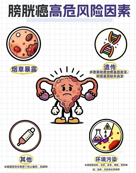 吸烟是诱发膀胱癌的首要元凶,长期吸烟的人患病风险是普通人的 2-4 倍,烟草里的有害物质会通过尿液排泄,持续刺激膀胱黏膜引发病变。长期从事橡胶、染料、油漆、皮革加工的人群,长期接触苯胺、联苯胺等化学物质,患病风险也会显著升高。