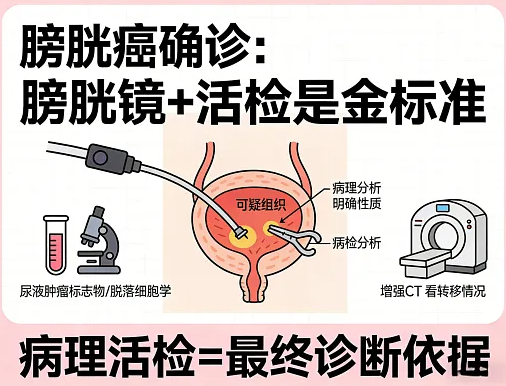 尿常规和尿脱落细胞学检查,可以捕捉尿液中的红细胞和癌细胞,适合初步筛查。而膀胱镜是确诊膀胱癌的 “金标准”,能直接观察膀胱内部情况,还能取组织做病理化验,准确判断肿瘤的性质和分期,为治疗提供依据。