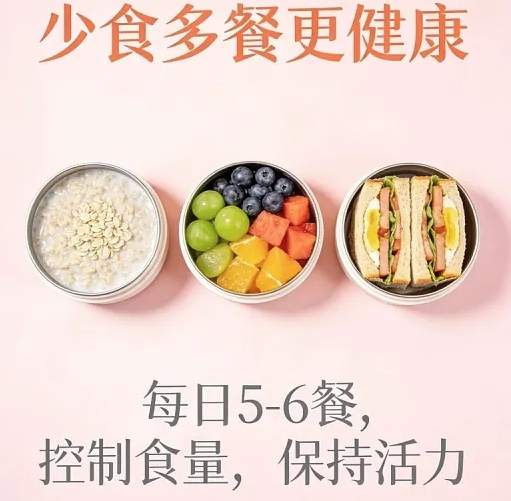 2. 进食原则:细嚼慢咽,少量多餐,每日 5–6 餐。