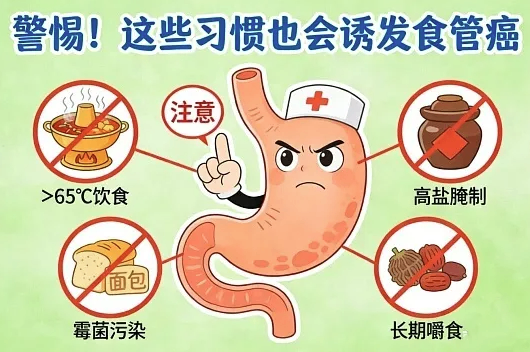 吃饭狼吞虎咽、不爱吃新鲜果蔬,身体缺了锌、硒这些微量元素,食管黏膜的修复能力会变差,也会给病变留机会。