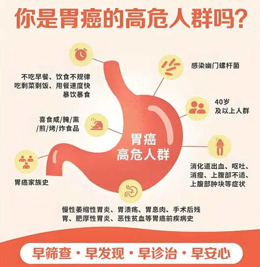 长期爱吃腌制、熏烤、过咸食物,吃饭不规律、爱喝烫茶烫粥的人,胃黏膜会反复受损,慢慢埋下癌变隐患。另外,有胃癌家族史,或是患有萎缩性胃炎、胃息肉、胃溃疡等胃病的人群,都属于胃癌高危人群,需要比普通人更关注胃部健康。