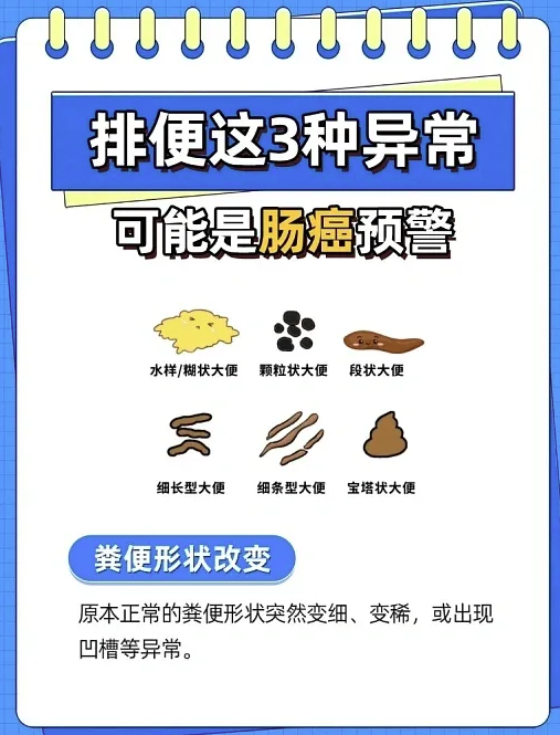 以前每天一次大便,突然一天三四次,还腹泻便秘交替,总觉得拉不干净,甚至大便带血、变细。这些都是结直肠癌的早期信号,别当痔疮自己用药。