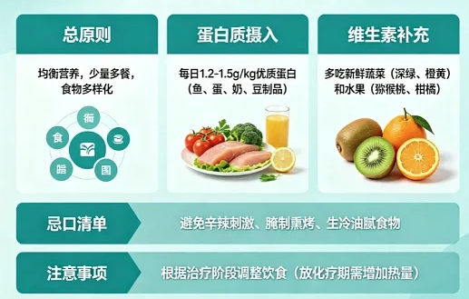 肿瘤治疗耗身子,营养跟不上,治疗效果就会打折扣。很多患者要么过度忌口、营养不良,要么盲目进补、加重负担,都不可取。核心就3个字:全、够、少。