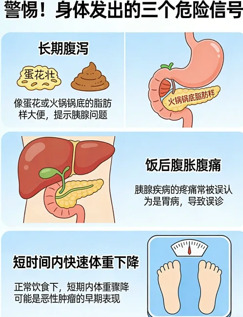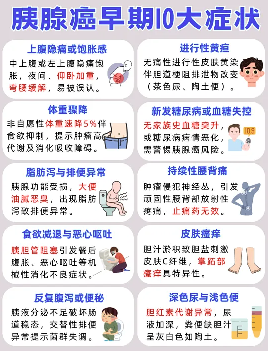如果同时出现肚子痛连着后背、皮肤和眼白突然变黄、一个月内瘦了十几斤,那就要高度警惕了。尤其是没有糖尿病家族史的中老年人,突然查出糖尿病,更要排查胰腺癌。