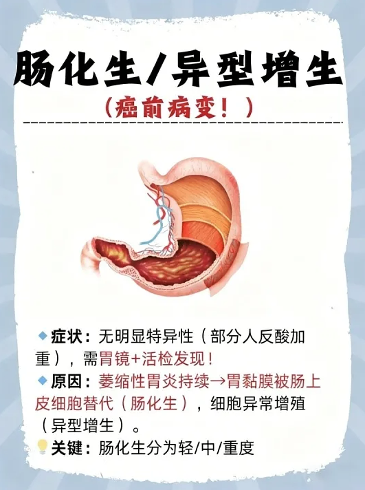咱们的胃黏膜癌变,从来都不是一步到位的,就像老房子慢慢朽坏,从普通的浅表性胃炎,到萎缩性胃炎,再到肠化生、异型增生,最后才会发展成胃癌。报告里出现这两个词,不是说你已经得了胃癌,是你的胃在扯着嗓子喊你:该管管我了!尤其是40岁以上、有幽门螺杆菌感染、常年老胃病的人,别嫌麻烦,每年一次胃镜,就是给胃上了最靠谱的保险。